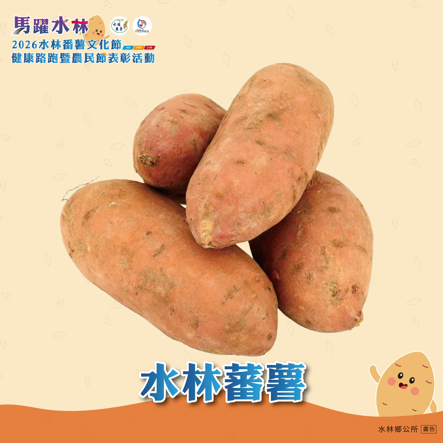 水林鄉是臺灣重要的番薯產地,素有番薯原鄉美譽,更是歷史超過三百年的開臺第一庄。水林番薯文化節已行之有年,今年將結合路跑活動盛大辦理;我們將在路跑過程中感受這歷史底蘊豐富的鄉村,也看見番薯為這鄉村帶來的經濟成長,活動除路跑外更有市集、水林番薯食農教育館、精采表演與摸彩活動,以及聯合辦理農民表彰節活動,歡迎全國朋友一同感受雲林縣水林鄉的全新面貌。